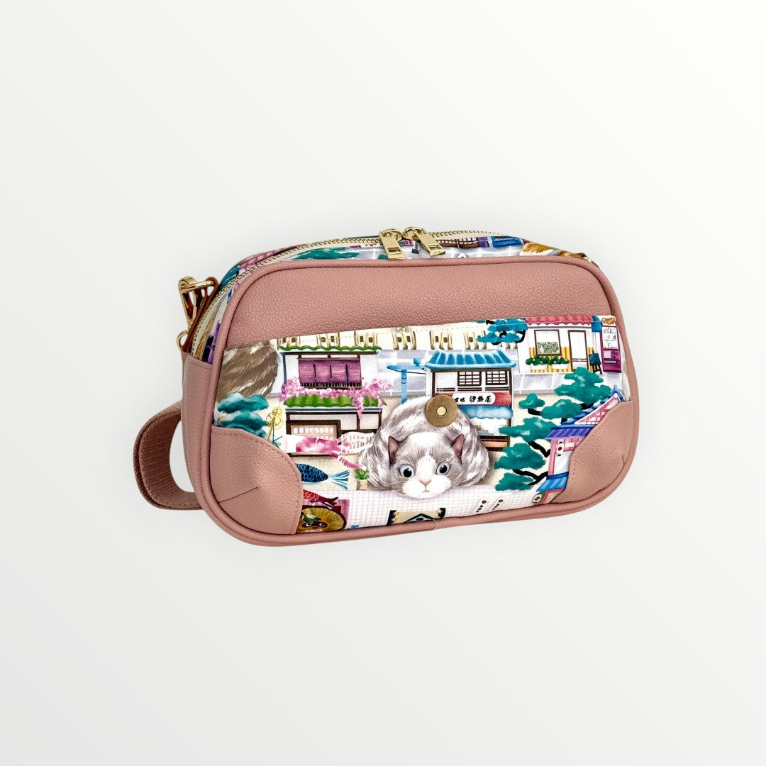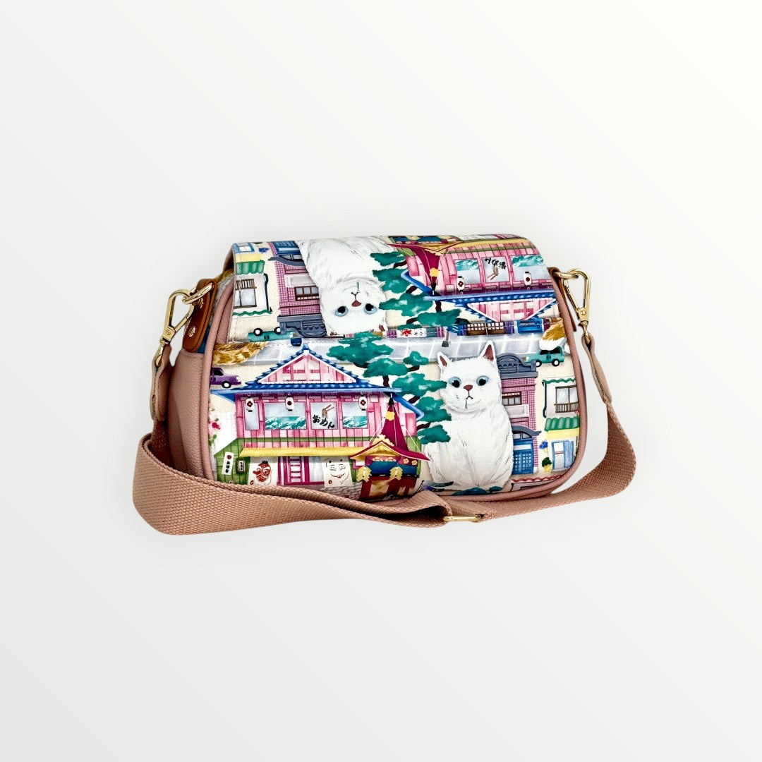 Take a walk through an illustrated Japanese street market—cat style! The Cat’s Town Sling Bag features a charming print of fluffy felines lounging across rooftops, vending machines, koi flags, and temples. It’s playful, eye-catching, and perfect for cat lovers with a love for wanderlust.
