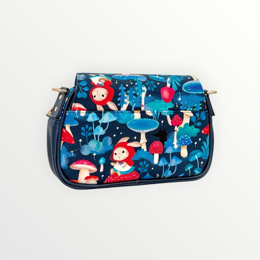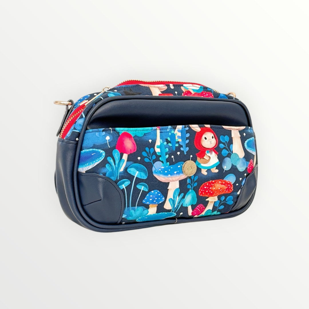 Step into a fairytale with the Scarlet Bunny & Wolf Sling Bag—a whimsical twist on the classic saddle bag, featuring a bold woodland design with red-caped bunnies, magical mushrooms, and a splash of deep forest blue. This charming piece is perfect for anyone who loves storytelling through style.
