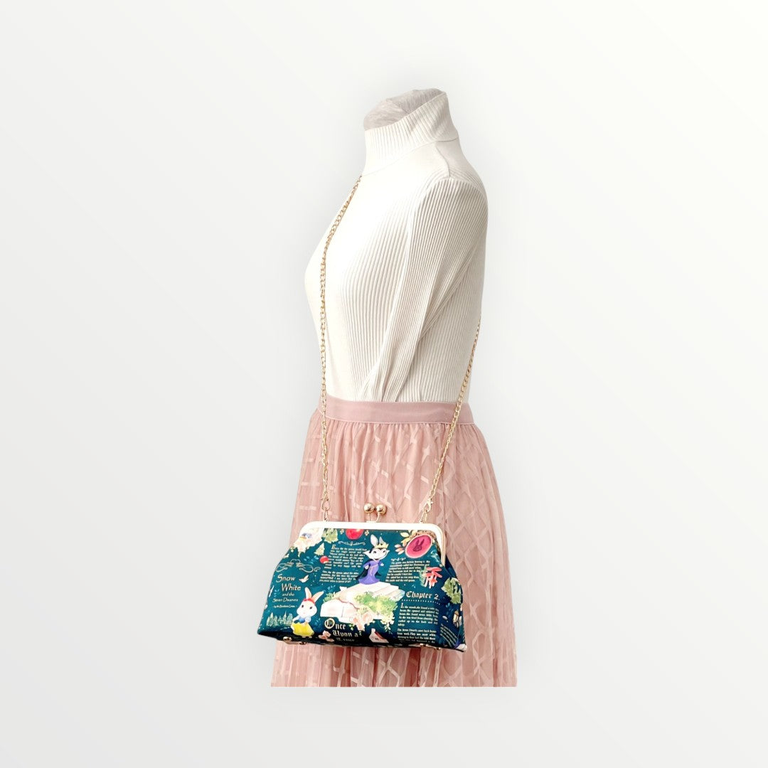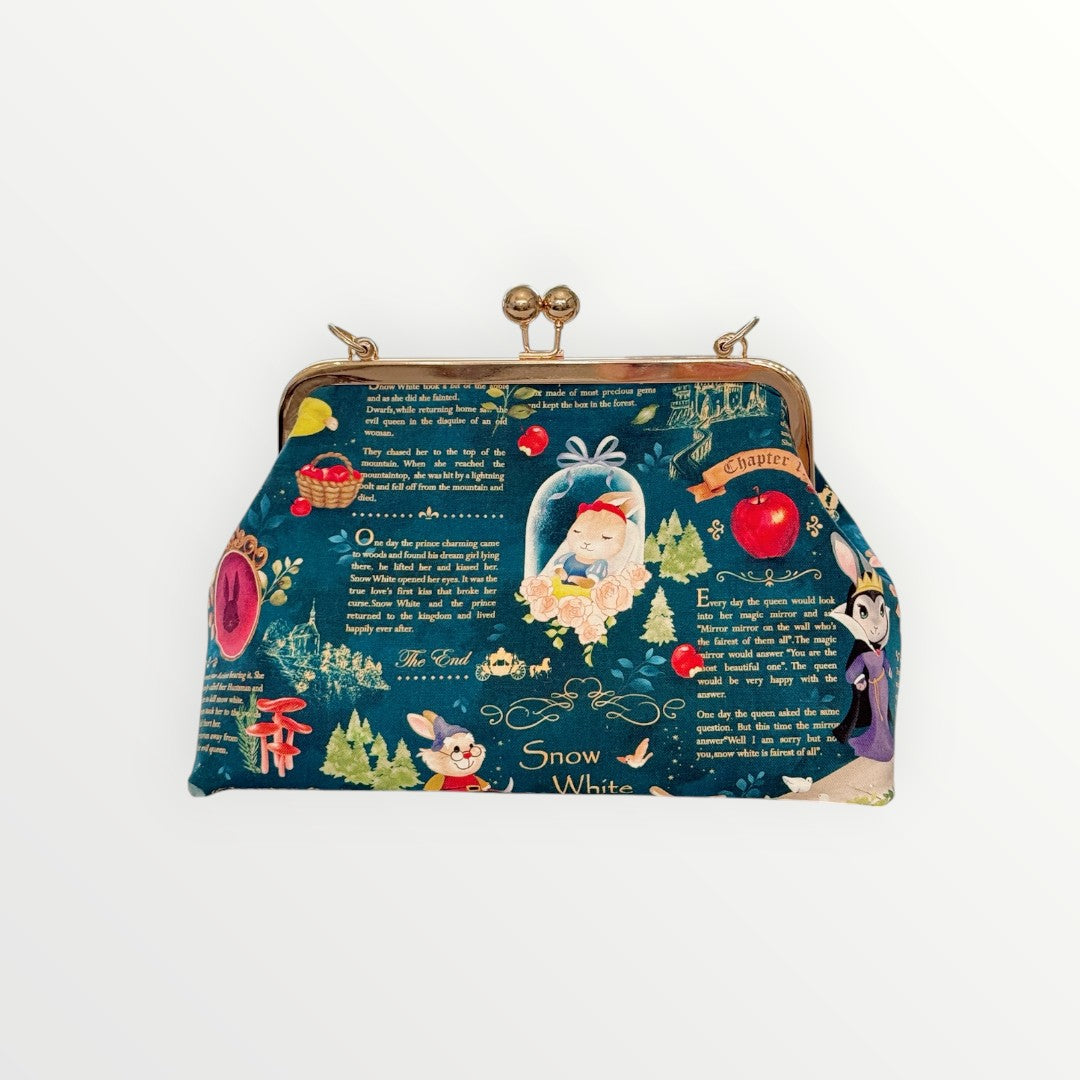 Step into a storybook with the Snowy Bunny Kisslock Bag, where handmade craftsmanship meets whimsical elegance. Inspired by the classic tale of Snow White, this enchanting design features bunny characters in a magical illustrated scene, framed by delicate floral and woodland elements.