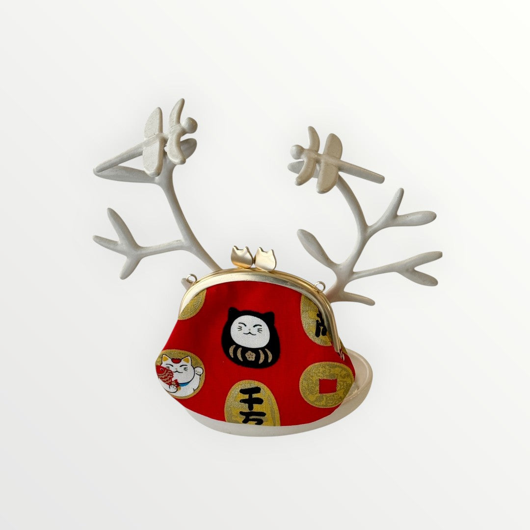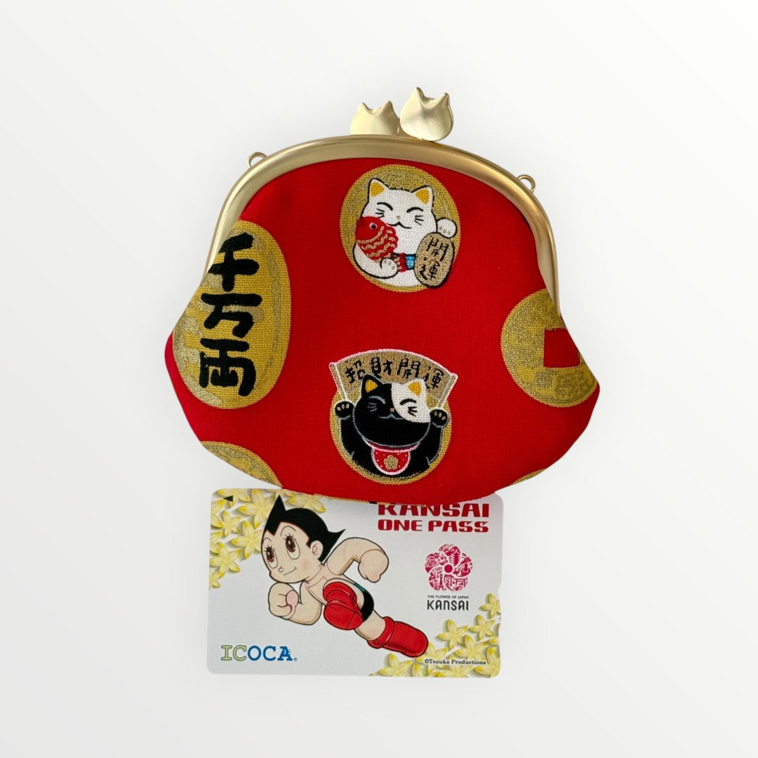 A pocketful of luck! This charming mini pouch features iconic maneki-neko (lucky cats) and gold coin motifs on a vibrant red background—symbolizing good fortune and prosperity.