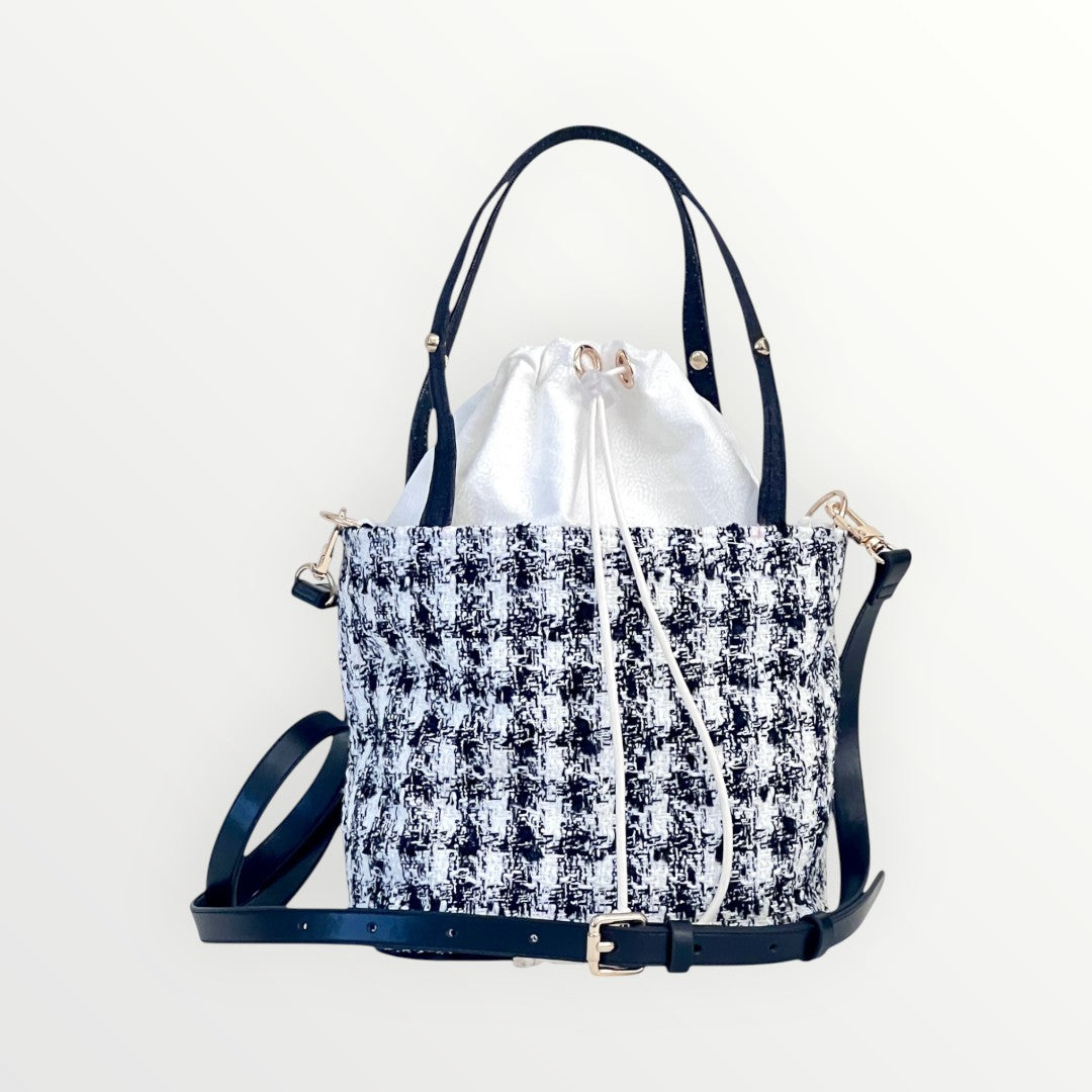 A statement in simplicity, the Mono Noir Bucket Bag blends classic monochrome with modern minimalism. Featuring a textured black-and-white fabric exterior and a soft satin-look drawstring lining, this petite piece is the perfect mix of form and function.