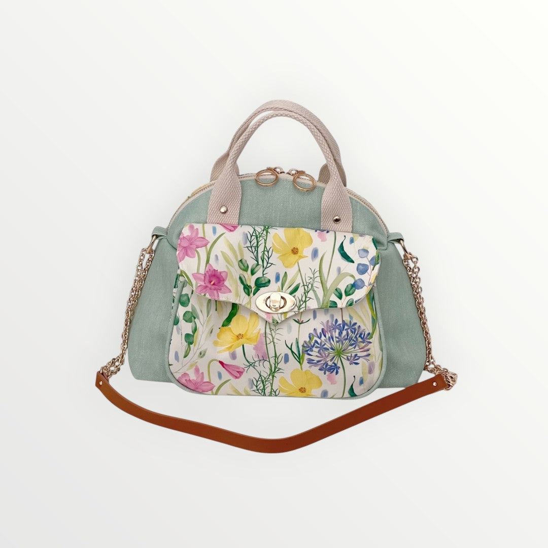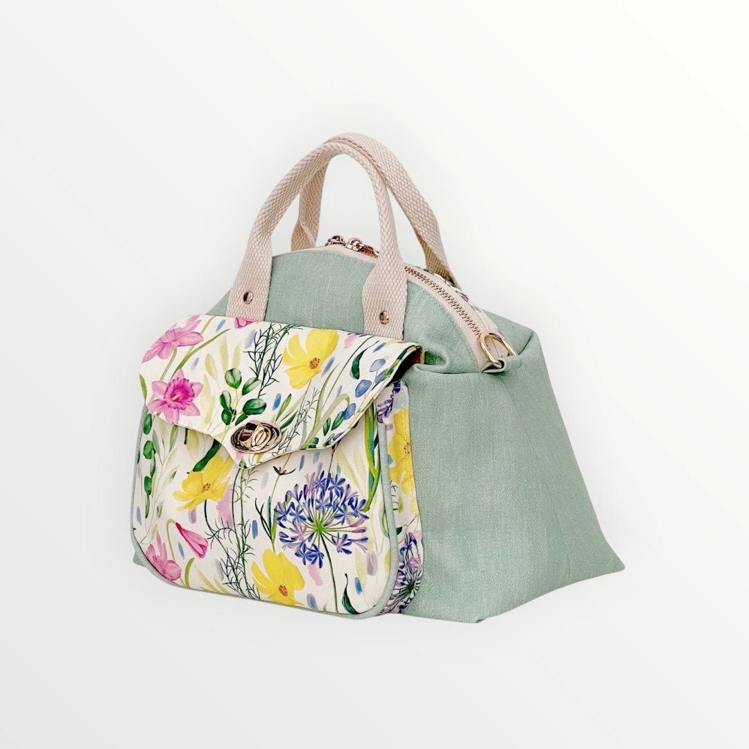 Fresh, feminine, and full of charm—the Mint Summer Flower Bowler Bag is designed to bring a soft, elegant touch to your everyday look. Featuring a stunning floral illustration on digitally printed, water-repellent fabric from Fabricology, this bag is where function meets beauty.